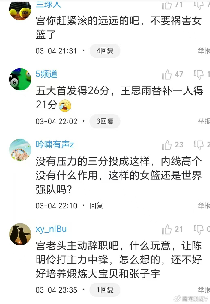 没错,中国女篮最大的短板的就是宫鲁鸣,不会训练,不会临场指挥,理念落后,看人眼力也特别差,居然把之前的李缘树为扛旗人,结果练了一二年就自我否定了。表现最好的王思雨在亚洲杯遭到打压,险些被淘汰出队。一年多以来,宫鲁鸣练不出新人,甚至老将不进反退,罗欣械就是明显的例子。球迷嘲笑道,宫鲁鸣是个人才啊,让中国女篮第四得9分,最后让巴西女篮超远三分打平。赶快主动辞职吧。诸位,你们说呢?